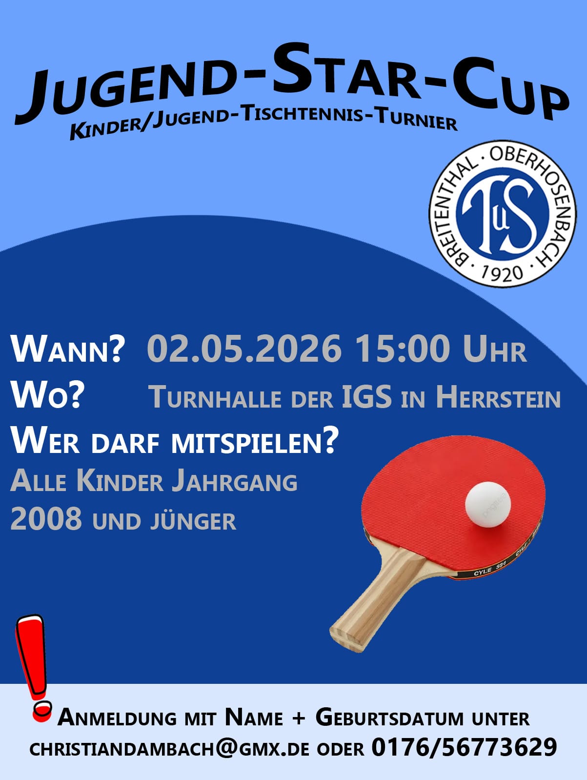 Am Samstag, den 02.05.2026 findet ab 15:00 Uhr der Jugend-Star-Cup des TuS B/O statt. Eingeladen sind alle Kinder ab Jahrgang 2008 und jünger. Das Turnier findet in der Turnhalle der IGS Herrstein statt.